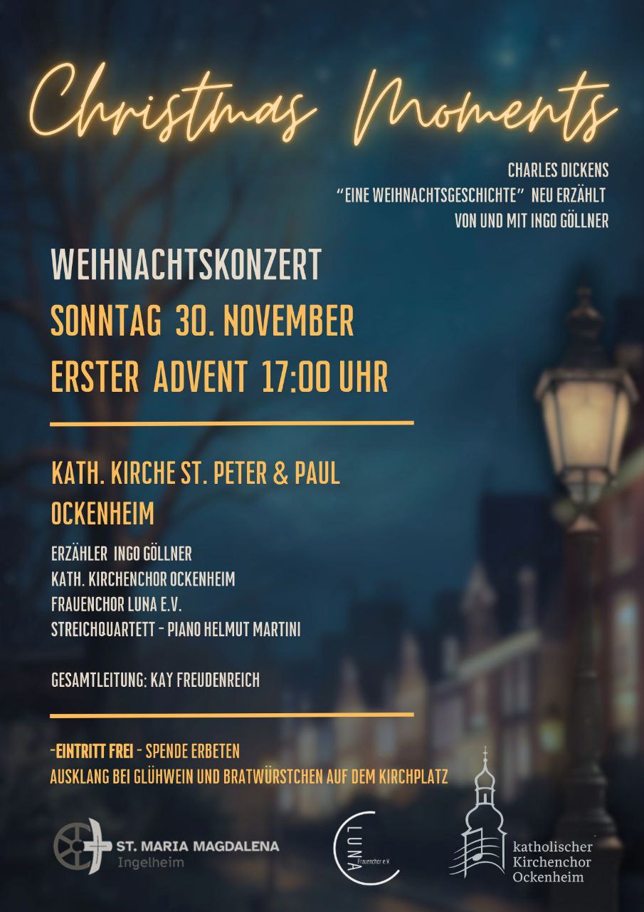 20.11.2025 Ein ganz besonderes Adventserlebnis erwartet euch! Der Kirchenchor Ockenheim verwandelt am 1. Advent die Kirche St. Peter & Paul in eine Bühne voller Klang, Gefühl und festlicher Magie. Unter der Gesamtleitung unseres Chorleiters Kay Freudenreich wird Charles Dickens’ weltberühmte Erzählung „Eine Weihnachtsgeschichte“ auf ganz neue Weise lebendig – in einem berührenden und stimmungsvollen Weihnachtskonzert. Als Erzähler führt Ingo Göllner durch die schaurig-schöne Geschichte rund um Ebenezer Scrooge. Musikalisch gestaltet wird das Konzert vom kath. Kirchenchor Ockenheim, unserem Frauenchor Luna, dem Povegliano Streichquartett sowie Helmut Martini am Piano.